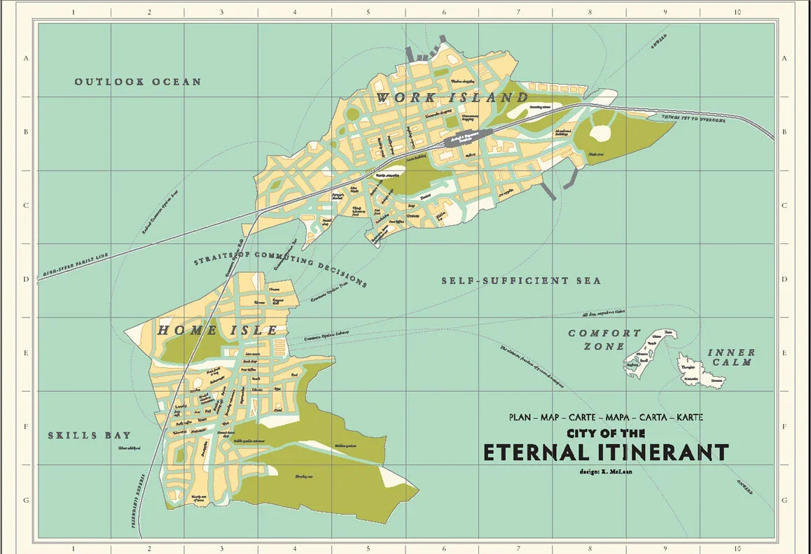“As a sensory researcher and designer my primary focus is on developing smell maps of different cities worldwide. As an initial stage in my exploration of linking place, human perception and emotion I investigated the notion of a city as perceived by a newcomer. Taking data from hand-drawn maps of a city seen after one month and six months I discovered that as newcomers to a city we create islands and links between them as a tool to understand where we are; we retain elements from our past such as friends, inner sanctuaries of self and simultaneously project into our future. In the map these elements of human perception are represented using the metaphors of geography, urban design and transport infrastructure. The Map of the Eternal Itinerant is a universally applicable personal visual reference.”